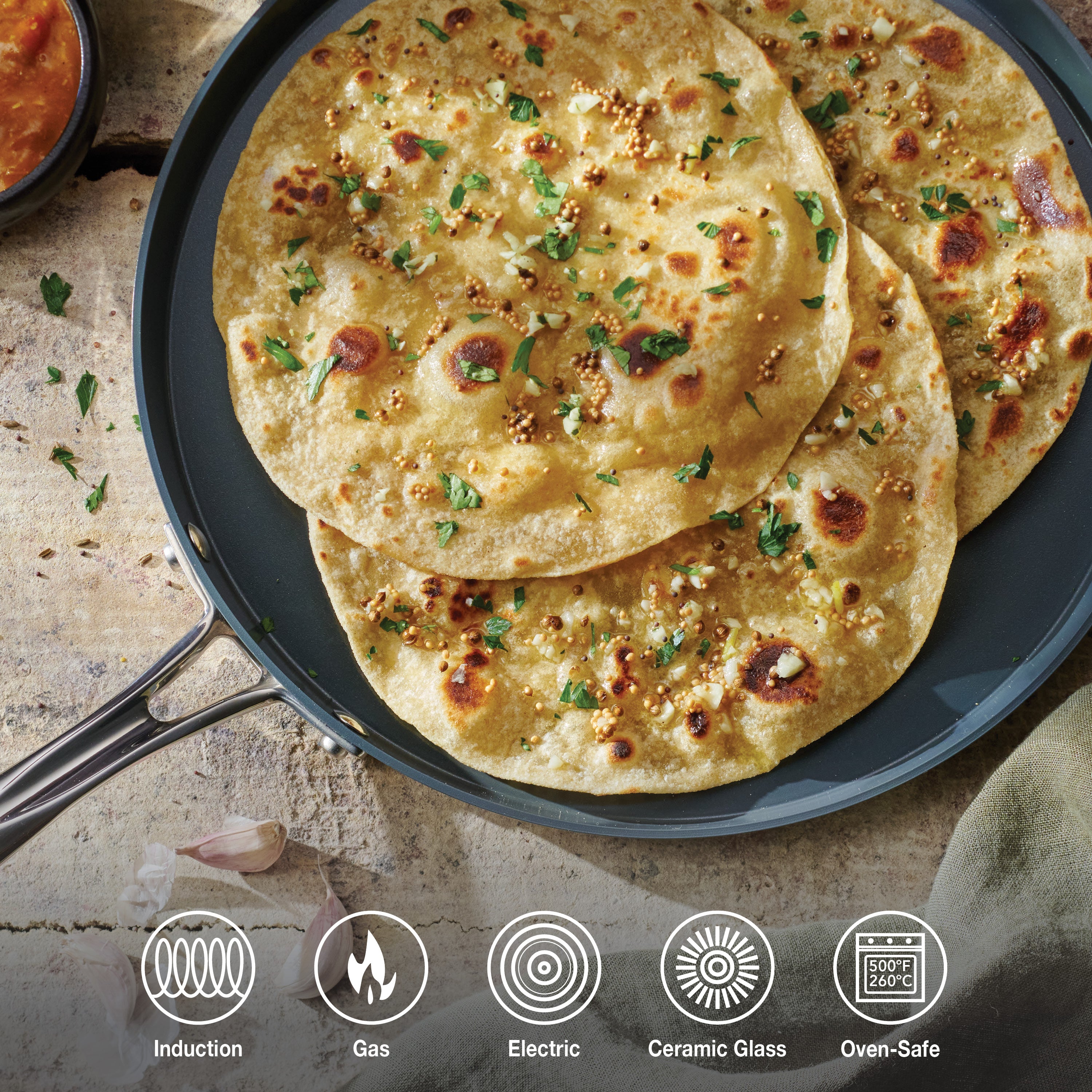 This tawa is compatible with all cooktops, including induction, and is oven-safe up to 400°F, making it versatile enough for a variety of cooking styles. The ergonomic, stay-cool stainless steel handle ensures safe and comfortable handling. From flipping and frying to quick steams, this pan is designed to keep you in control.
