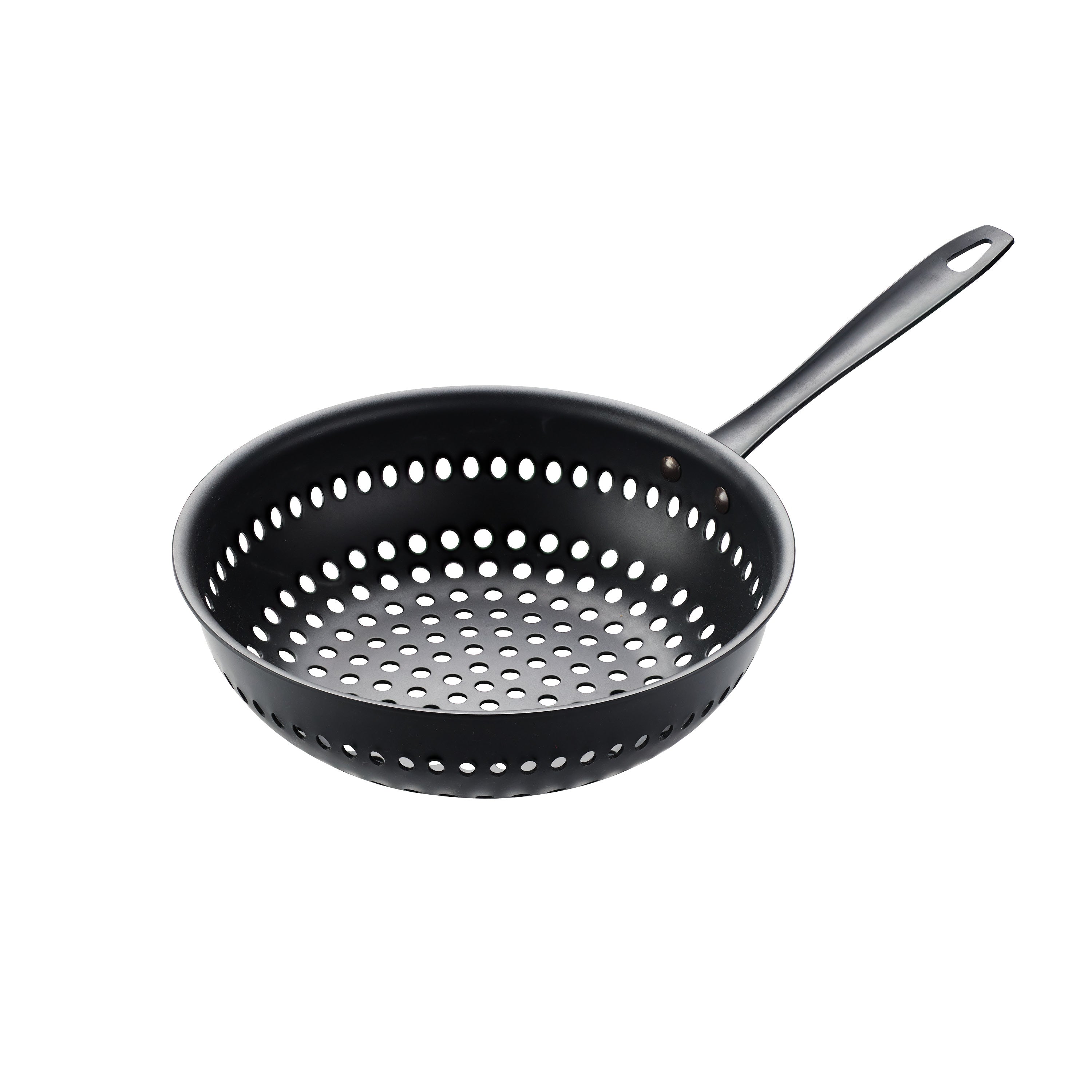 The Tramontina 10" Round Perforated Carbon Steel Stir Fry brings the pleasure of stir fry cooking to the great outdoors. Made of sturdy carbon steel with heavy-duty rivets that secure the handle, able to endure the heat of a grill as you prepare your favorite meats and vegetables al fresco. Holes throughout the bottom and sides evenly distribute heat and enhance smoky flavor. Made to last in Brazil, this wok comes with a lifetime warranty.