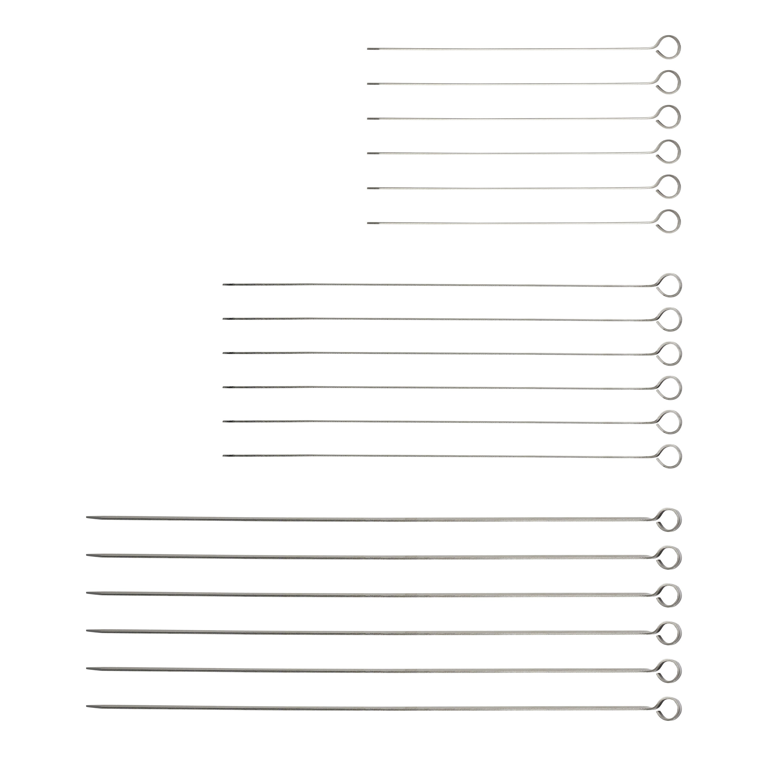 Season and skewer plenty of meats, veggies, and fish to make the most of your summer barbeques - and make delicious meals every season of the year. This 18 Pc Skewer Set includes six 8 in skewers, six 12 in skewers, and six 16 in skewers to fill every inch of that grill surface or oven. Made of sturdy stainless steel in Brazil, these skewers are dishwasher-safe and easy to clean.