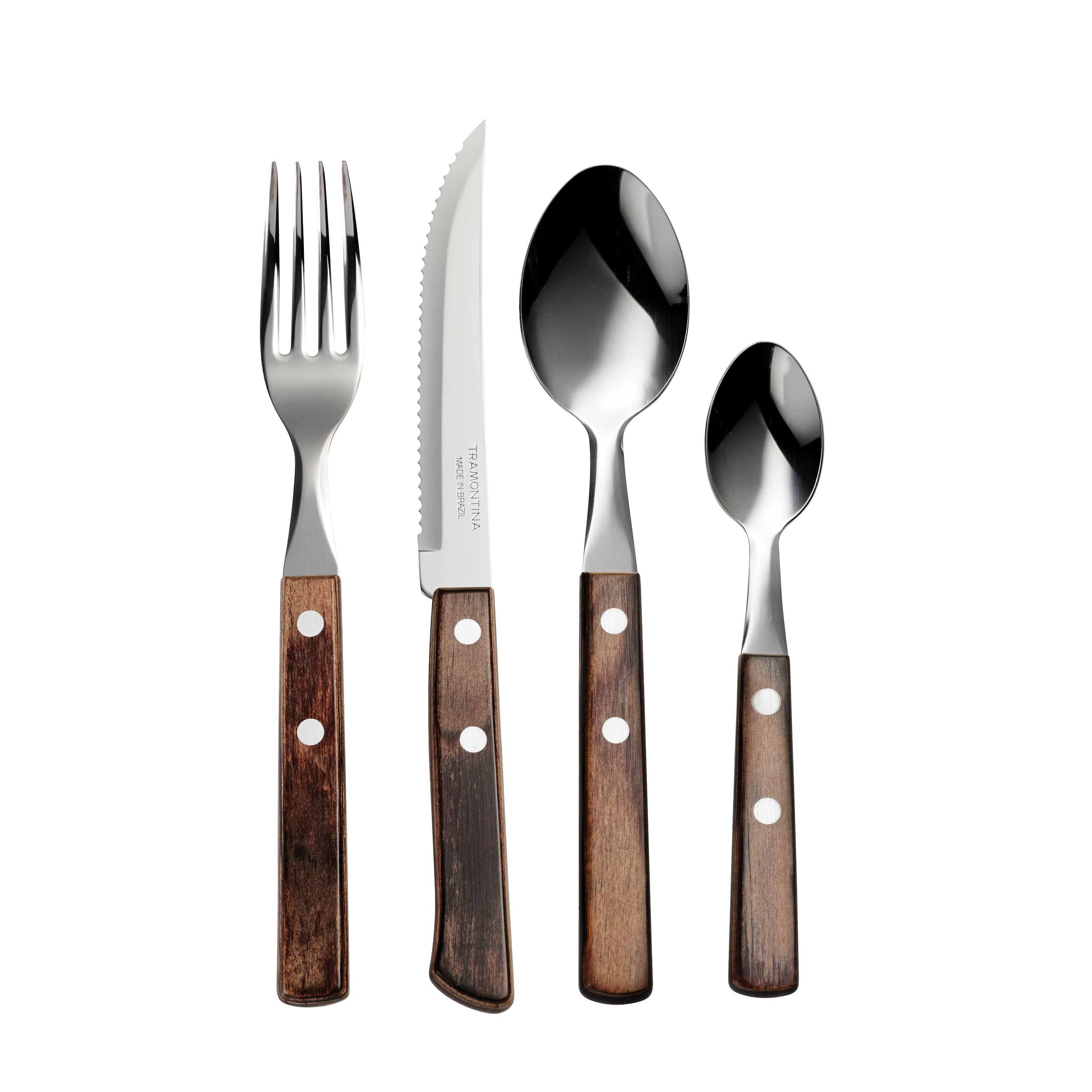 Looking to upgrade your tableware or give a great housewarming gift? The Tramontina 24 Pc Tableware Set will fill a utensil drawer with durable, artfully constructed steak knives, table forks, spoons, and teaspoons. The steak knives have mirror-polished, serrated edge blades of stainless steel. Polywood handles hold the blades in place with three solid alloy rivets. The table forks, tablespoons, and teaspoons are made of stamped, mirror polished stainless steel, and have matching Polywood handles with two solid alloy rivets. Post-meal clean-up couldn't be easier as all utensils are dishwasher safe. The whole set has a 5-year Warranty, and it is made in Brazil.