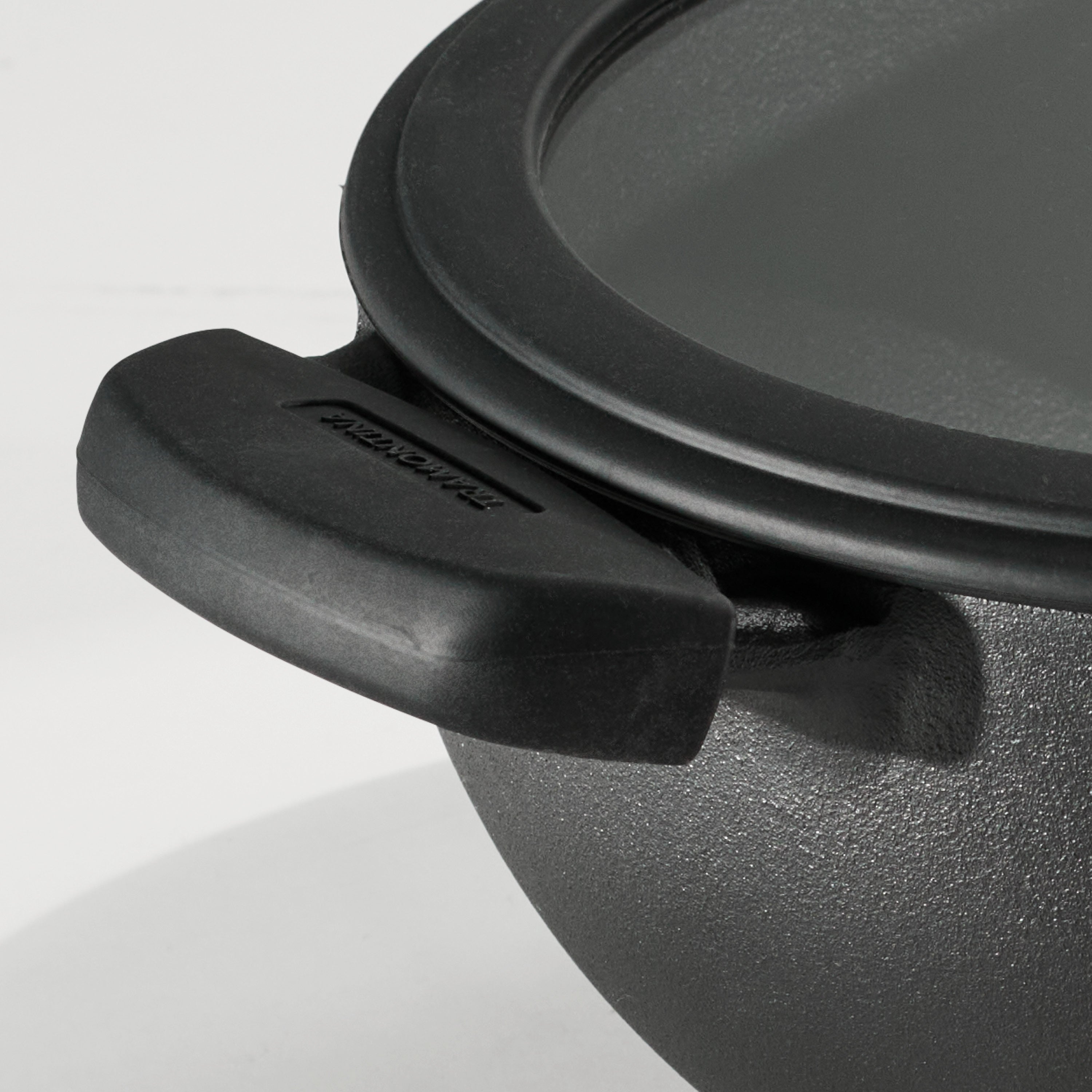 The stone-ground smooth interior enhances food release, helping your dishes maintain their shape and texture. Its pre-seasoned natural oil finish improves with use, developing a well-seasoned surface over time. The shatter-resistant tempered glass lid with a black silicone rim locks in moisture and controls heat circulation, allowing you to monitor food without lifting the lid.