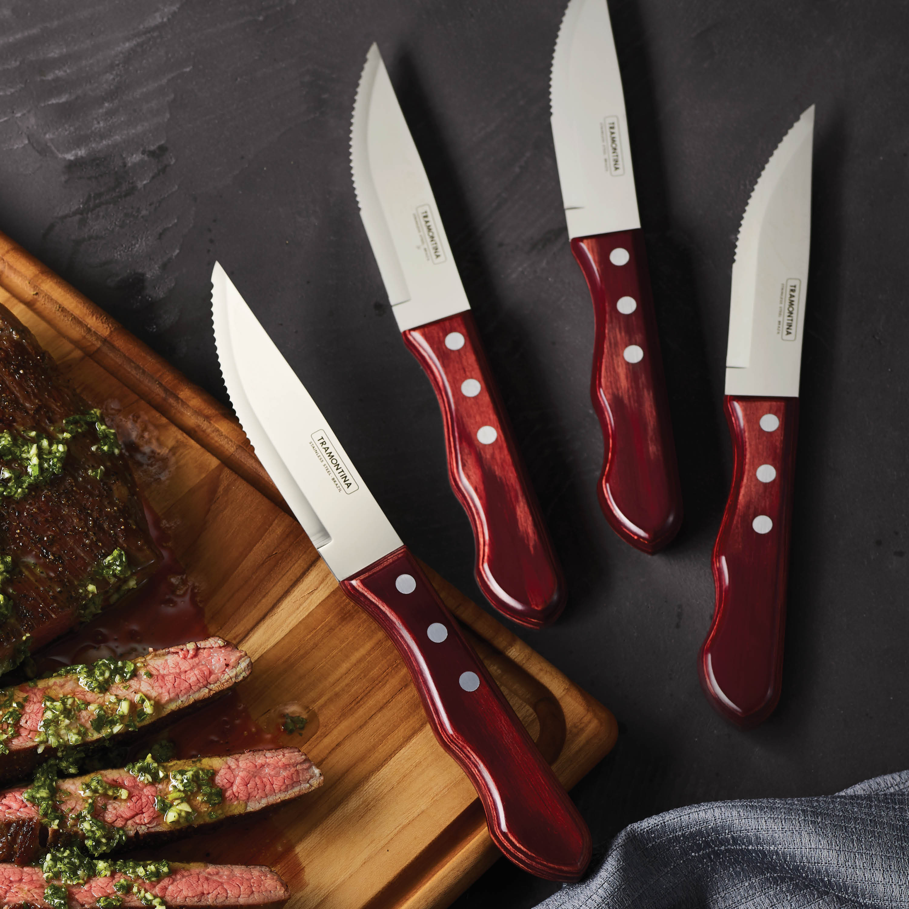 Tramontina's Porterhouse 4-Pc Steak Knife Set delivers exceptional sharpness, quality construction, durability, and the elegance of a steakhouse to your table. The stain-free, high carbon steel, serrated blades of the Porterhouse knives effortlessly slice through savory steaks and other cooked meats, while the dishwasher-safe, dark brown Polywood handles allow for easy cleanup. Made in Brazil.