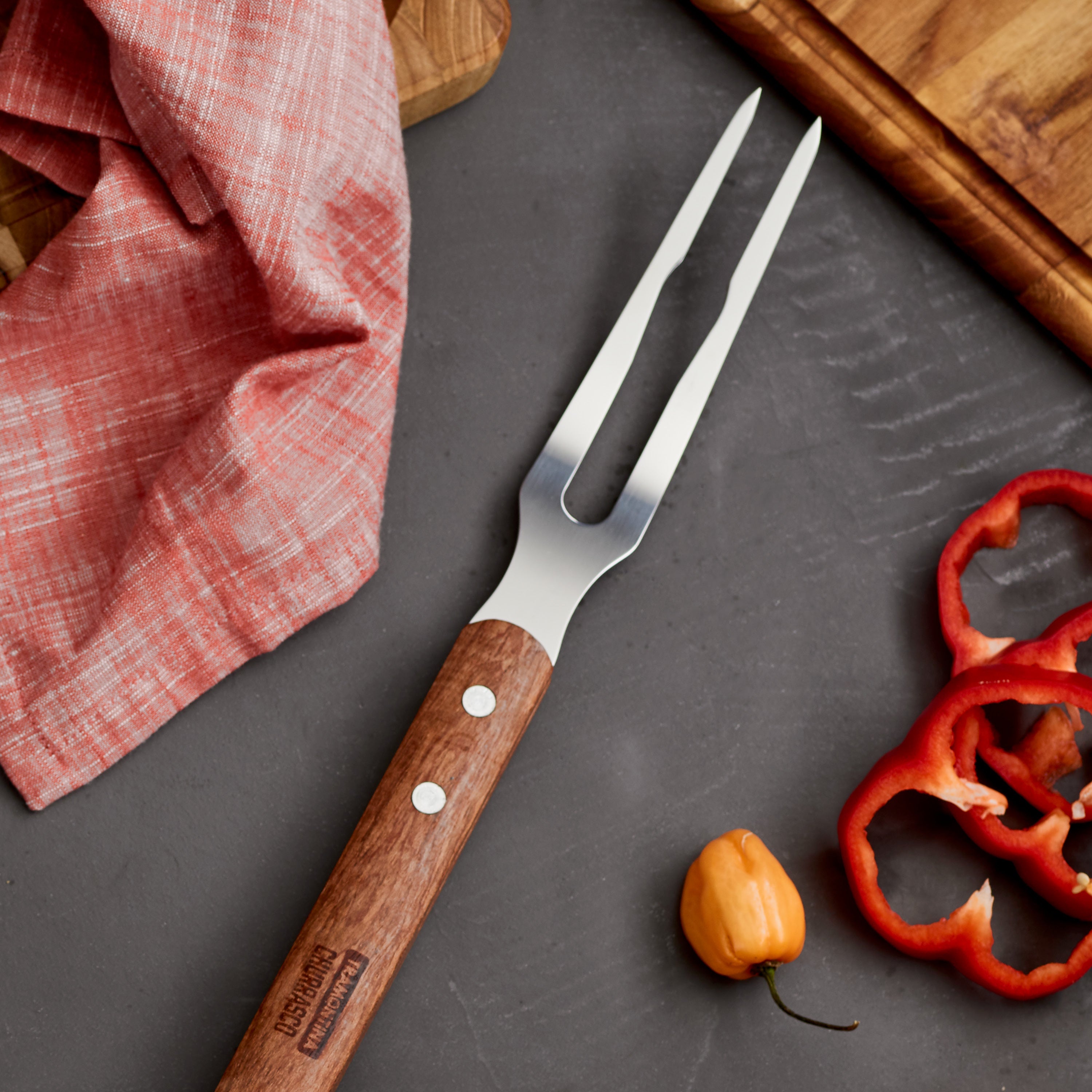Fire up your backyard barbecue and equip yourself with Tramontina's Churrasco 3 Pc Stainless Steel BBQ Utensils Set for an authentic Brazilian sizzle. You'll find it easy to flip, turn, handle, and transfer meat, vegetables, and more. The fork, tongs, and spatula are constructed from stainless steel for durability. Each piece showcases a mirror-polished finish with a Jarobi wood handle. Made in Brazil.