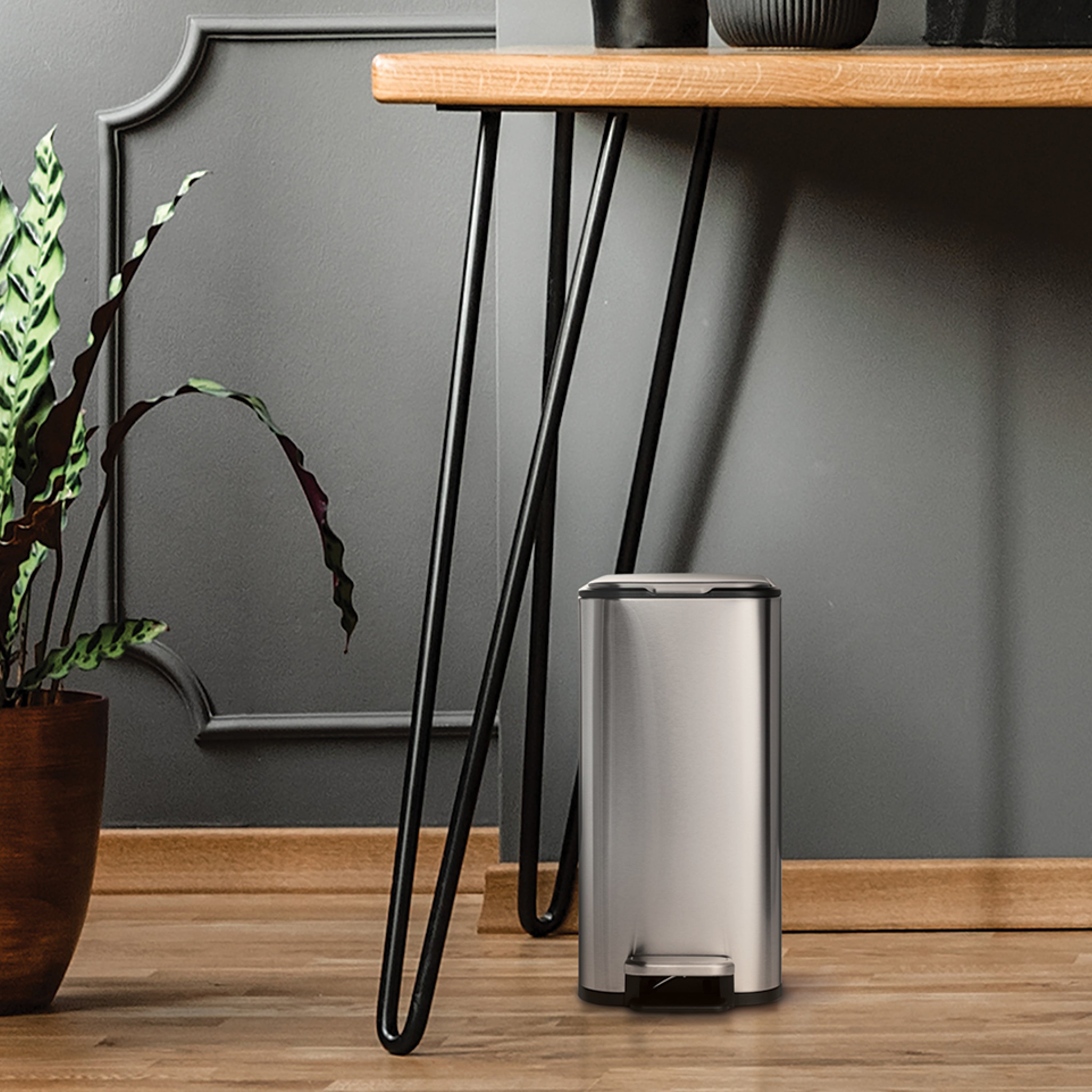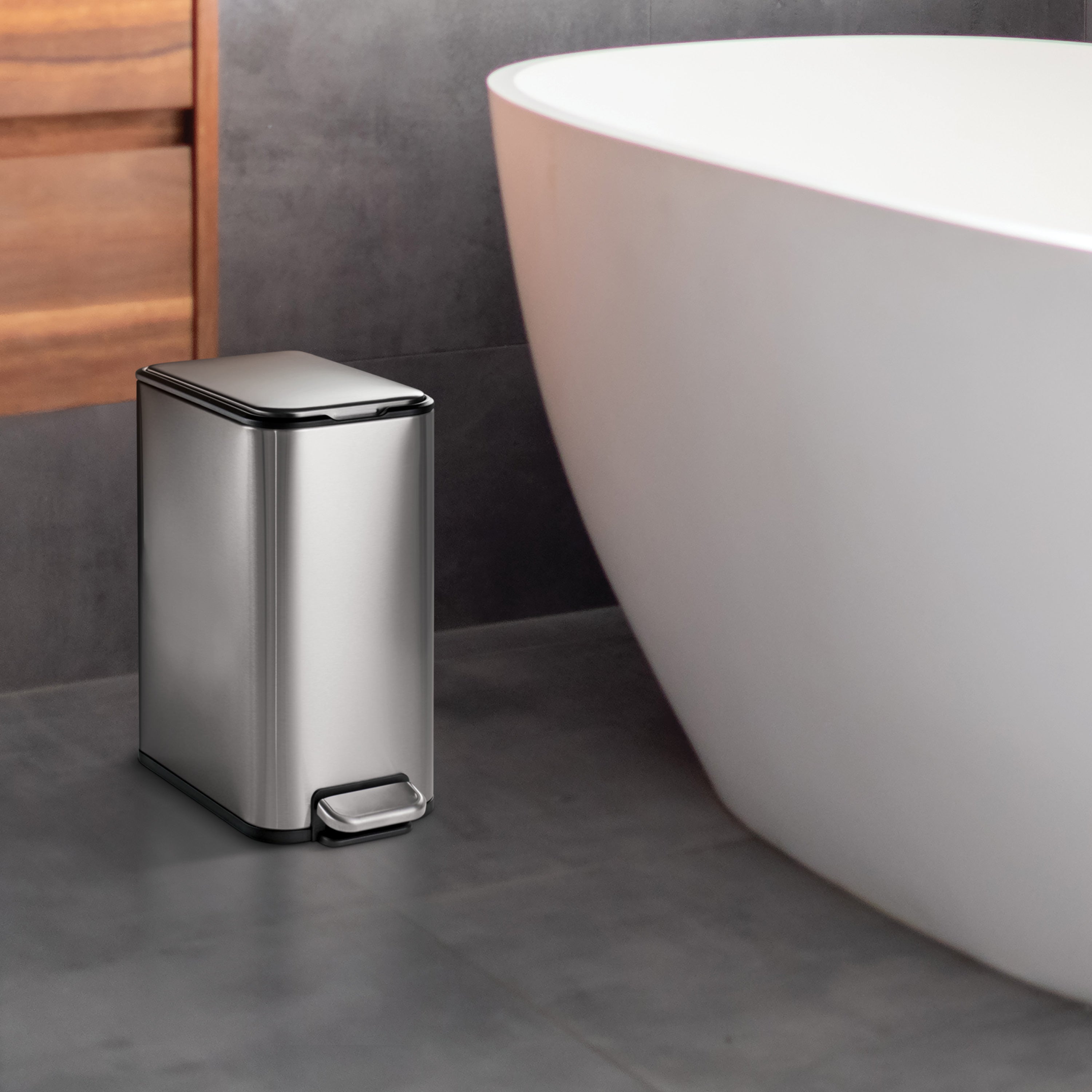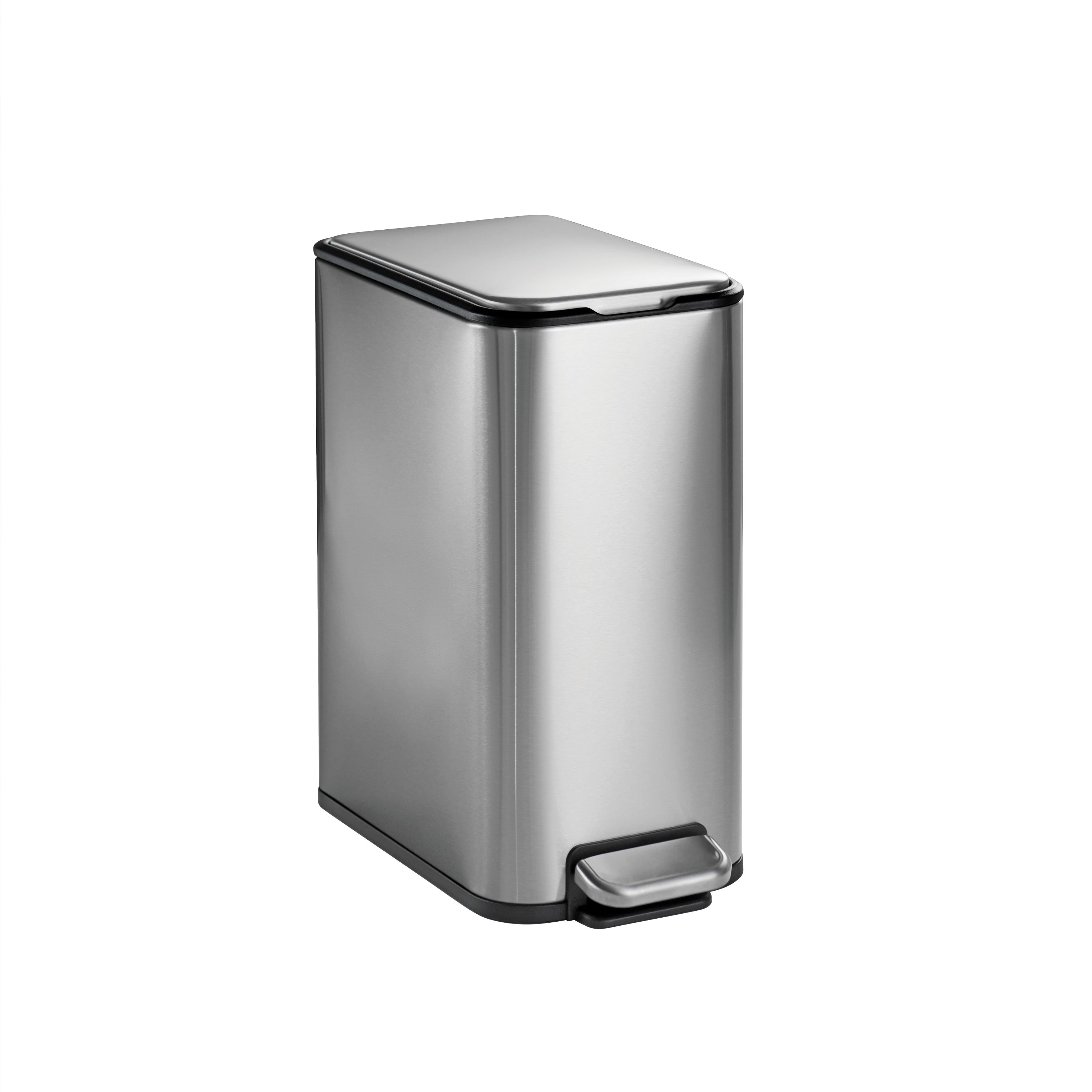 The Tramontina 2-Gallon Space-Saving Step Cans combine practicality and modern design, making them an excellent waste management solution for bathrooms, offices, or compact spaces. Available in powder coat white, black, and stainless steel, this 2-pack includes matching rectangular step cans that fit seamlessly into any room while keeping your space tidy and organized. Built with durable materials, the powder coat finishes offer a smooth, easy-to-clean surface, while the stainless steel option resists stains and fingerprints for a polished look. The soft-close lid provides a gentle, quiet closure, and the stainless steel-accented foot pedal ensures hands-free and hygienic waste disposal. Each can includes a removable polypropylene liner with a vented design, making bag changes quick and hassle-free, and accommodates 2-gallon (7.6L) trash bags effortlessly. These Tramontina space-saving step cans are versatile and compact, perfect for any modern waste management need, whether used together or in separate rooms.