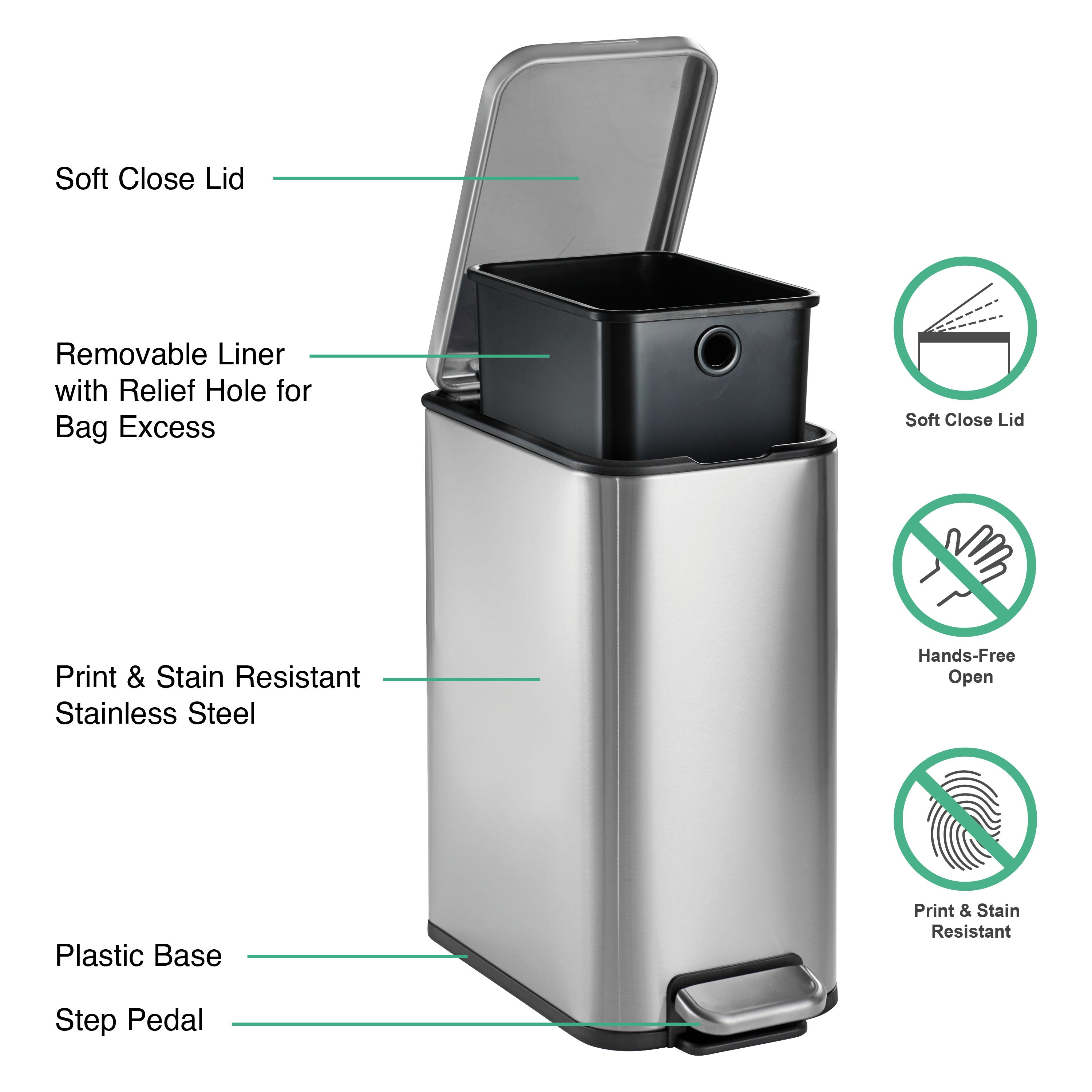- Compact size accommodates 2-gallon (7.6L) trash bags