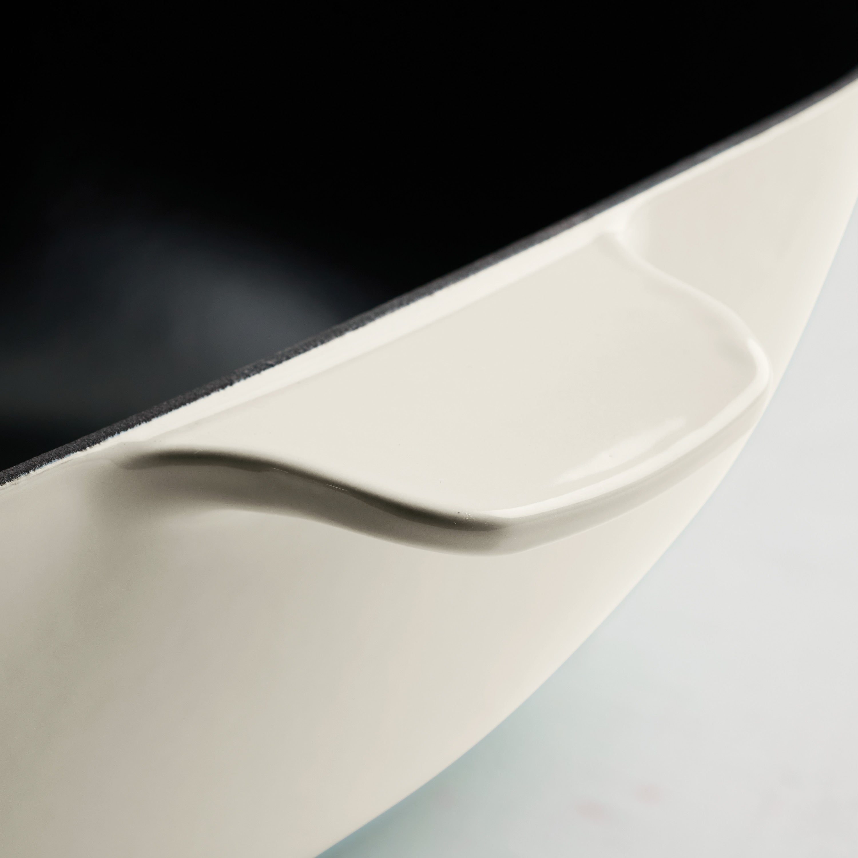 Each Cultura Multi-Cooker is built from durable cast iron and finished with a high-gloss, porcelain enamel exterior that’s free from heavy metals and engineered for lasting performance. Its matte black enameled interior provides a naturally smooth, non-reactive surface that ensures even heat distribution for perfect searing, simmering, and baking.