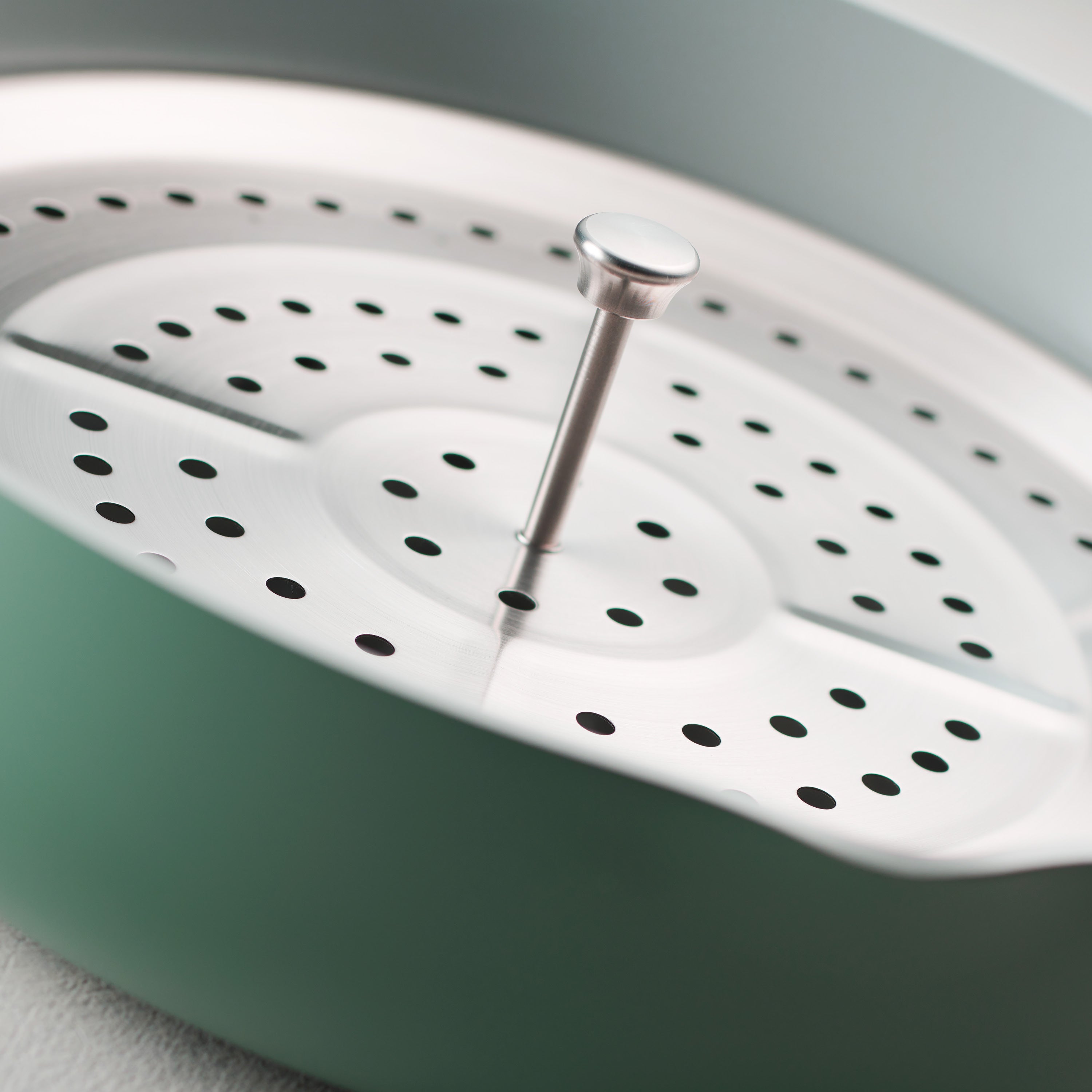 - Aluminum lid with stainless steel handle that doubles as a spoon rest