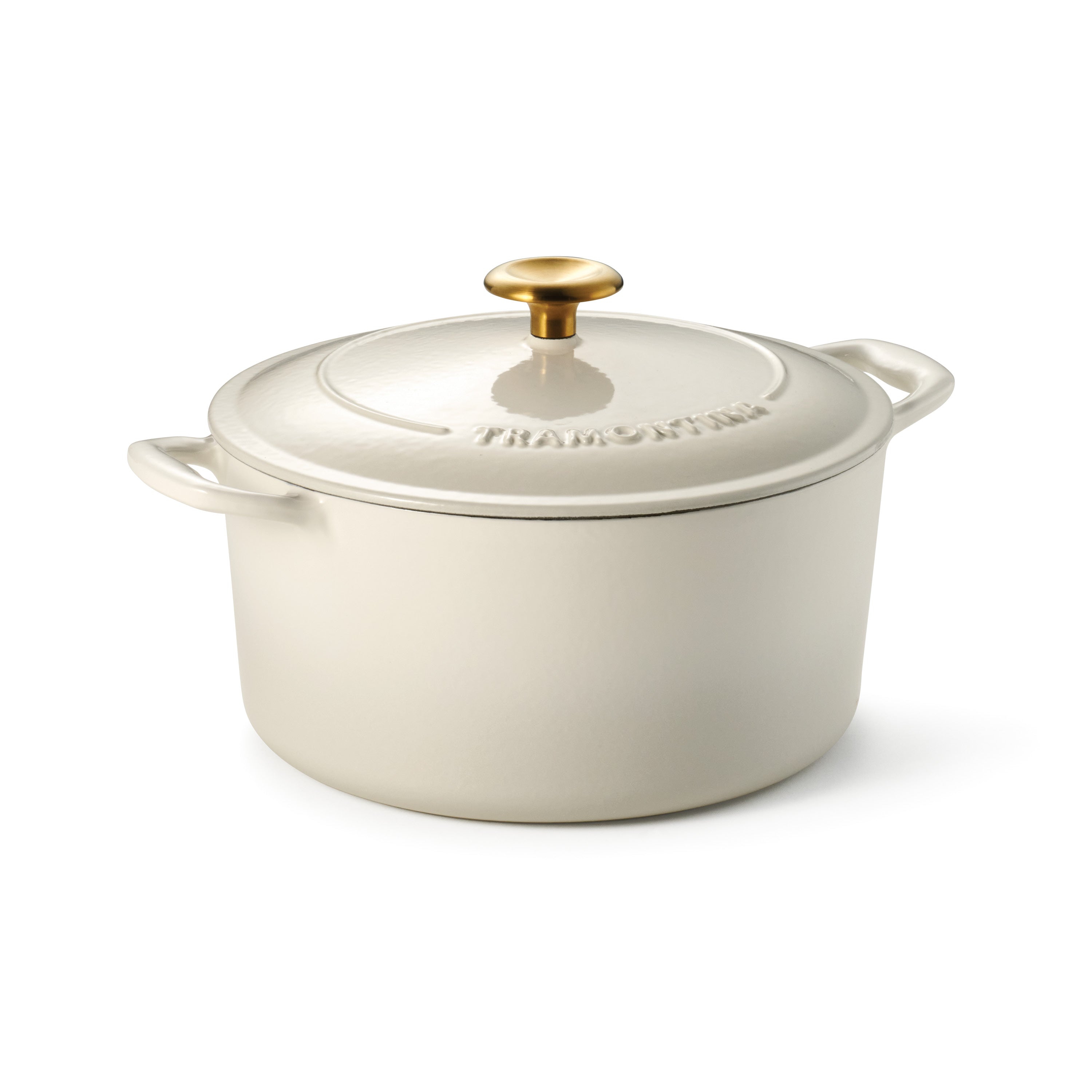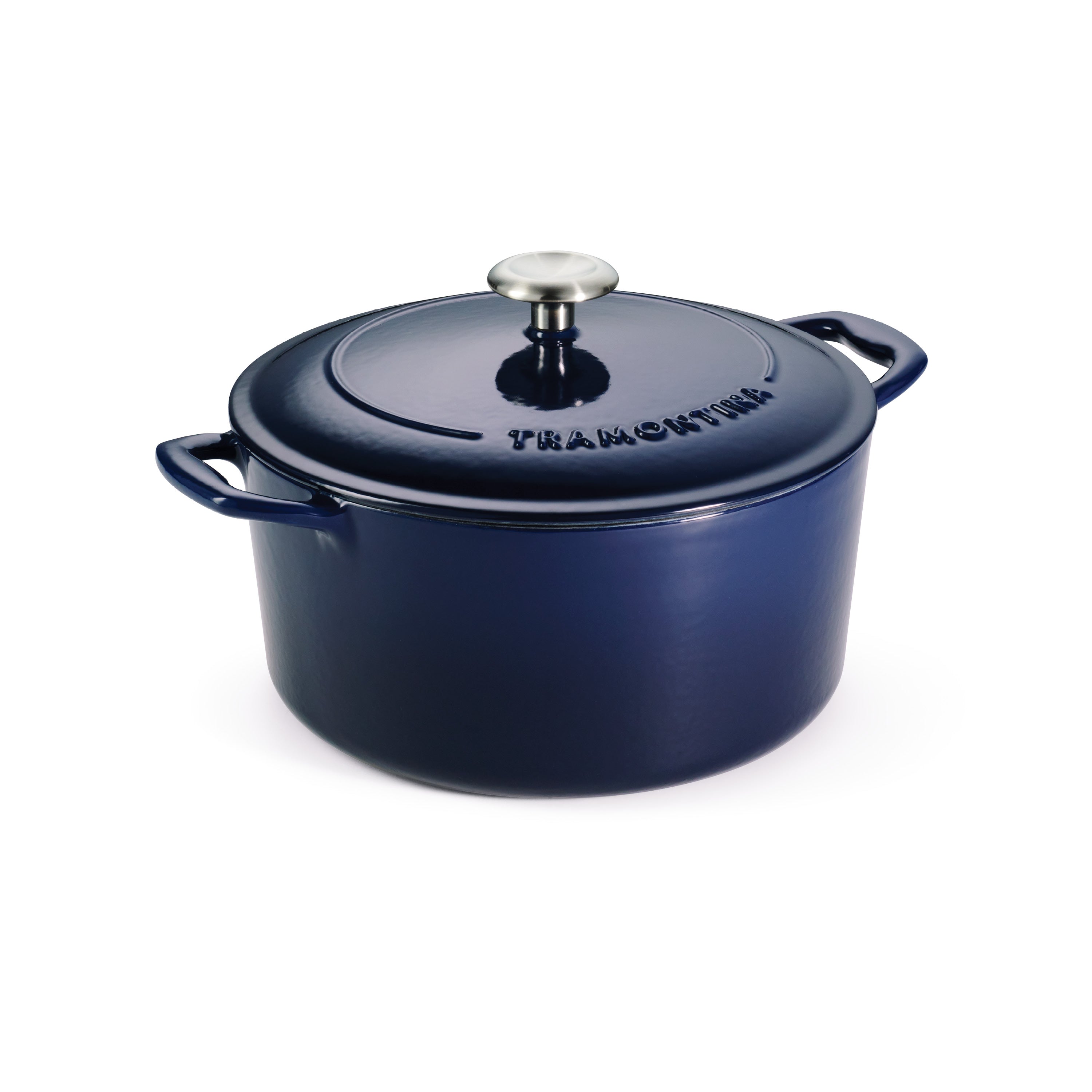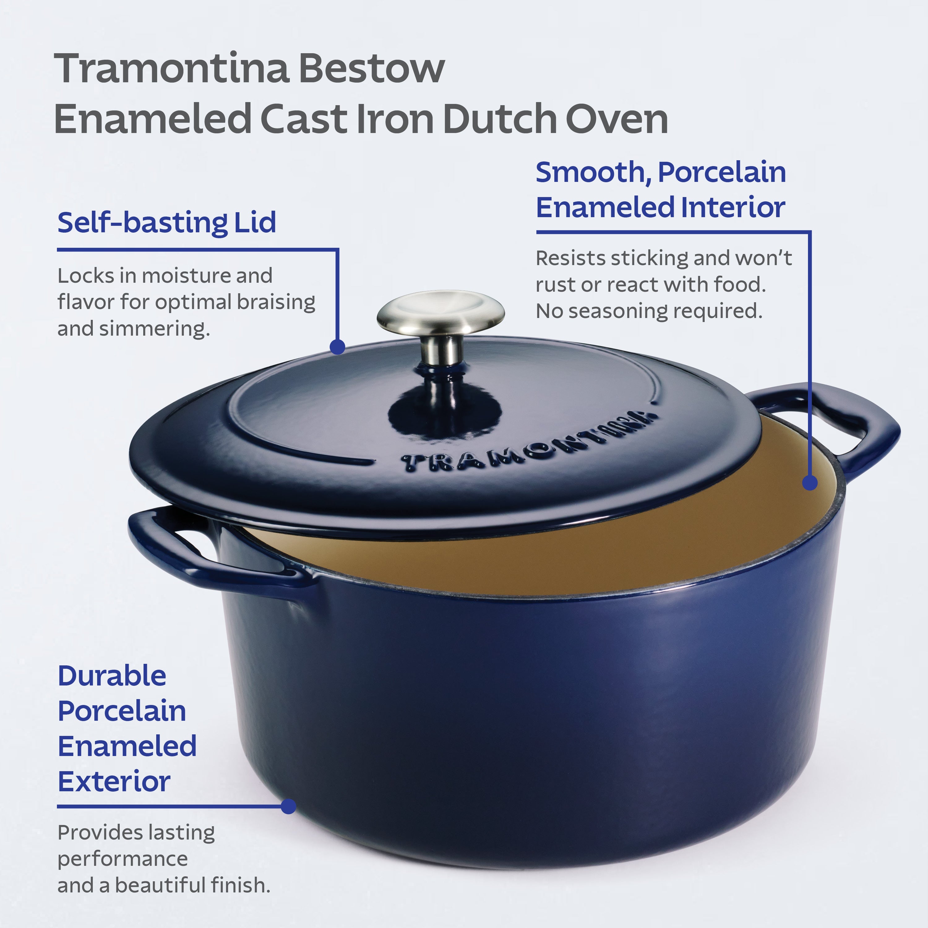 Tramontina's 5.5 Qt Enameled Cast Iron Round Dutch Oven is the perfect piece for experienced chefs, home cooks, busy parents, even those new to cooking or who are short of kitchen space. The one-pot jack-of-all-trades can handle casseroles, soups, stews, side dishes, breads, cobblers, puddings - the list is practically endless. Your guests will love the mouth-watering flavors enhanced by the pan's self-basting lid. Cooks will love everything else - from heat retention and even cooking, to a porcelain-enamel exterior finish for elegant kitchen-to-table serving, and sturdy side handles for easy manageability.