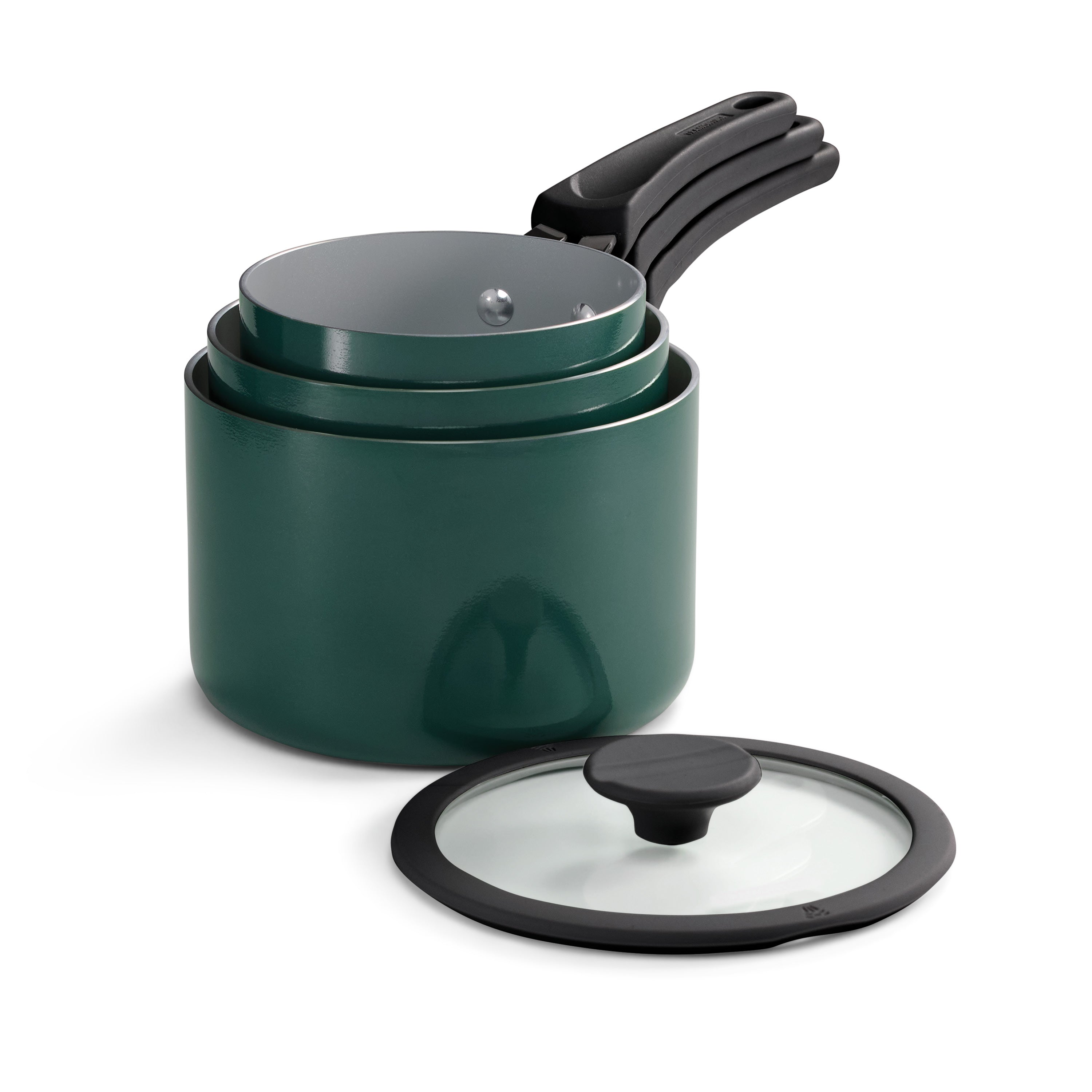 Soft-grip handles stay cool and comfortable while cooking, and shatter-resistant glass lids let you keep an eye on every simmer. When you’re done, the entire set nests neatly together, saving you up to 50% more cabinet space.