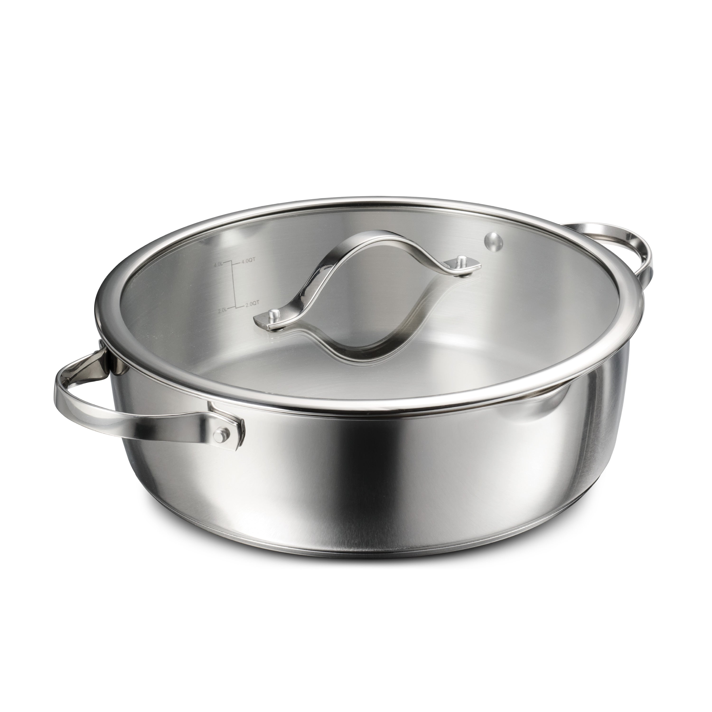 Sear, saute, braise, and serve - the Tramontina Tempo 6-Quart Covered Braiser is designed to do it all. Whether you are slow-braising short ribs, pan-roasting chicken, or making a one-pan pasta dish, this braiser locks in moisture and builds rich, deep flavors with minimal effort. Crafted with a tri-ply base construction, it features an impact-bonded aluminum core that distributes heat quickly and evenly, preventing hot spots and ensuring consistent cooking. The premium 18/8 stainless steel cooking surface is non-reactive, so your sauces and ingredients stay pure, while the mirror-polished exterior adds a sleek, professional touch. The shatter-resistant tempered glass lid keeps heat and moisture locked in while letting you monitor your meal, and the wide, riveted stainless steel handles offer a secure, balanced grip - perfect for moving from stovetop to oven (up to 400°F). And when dinner's done? It is dishwasher-safe for easy cleanup. From family-style meals to elegant entertaining, the Tempo 6-Quart Braiser is built to keep up. Set the pace. Own the kitchen.